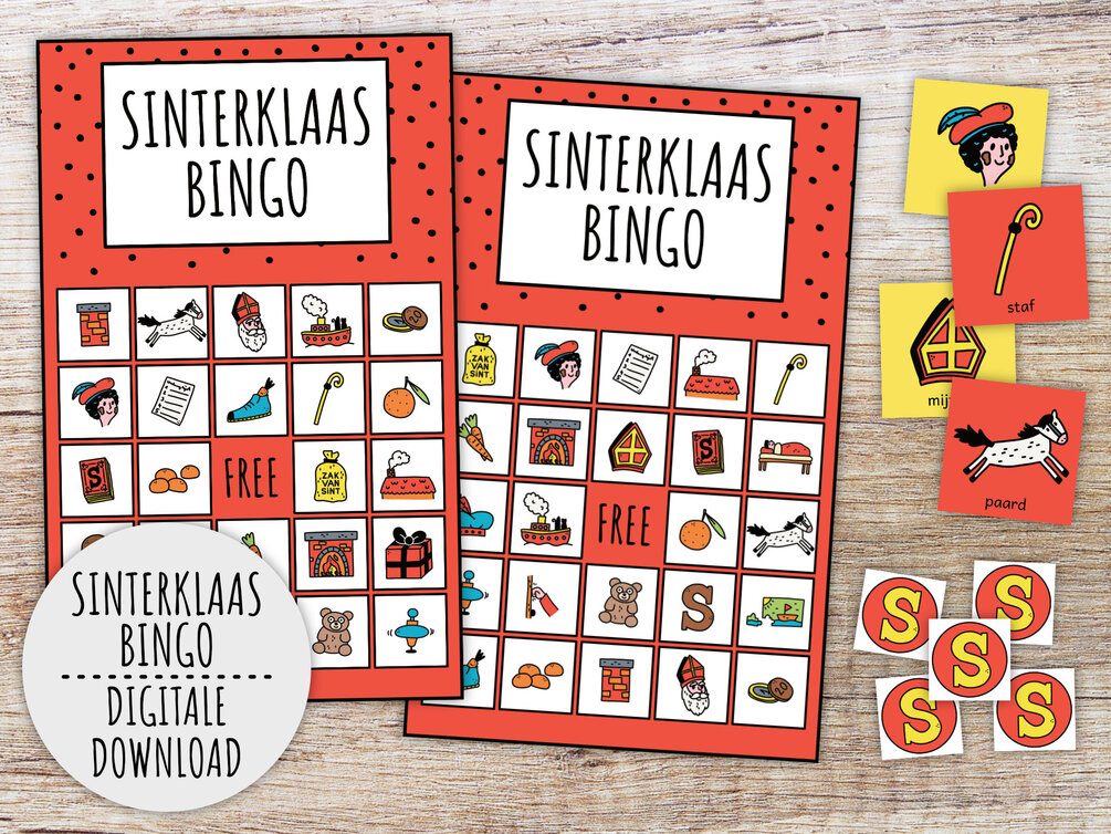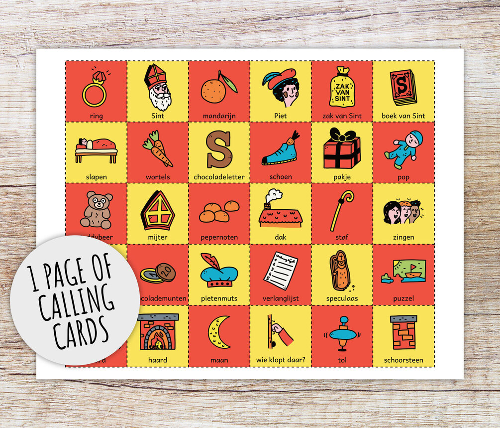 Sinterklaas bingo voor kinderen, Sint Pakjesavond Bingo, Nederlands Sint Maarten, Sint en Piet feestspel (afdrukbare PDF in kleur + Z/W)