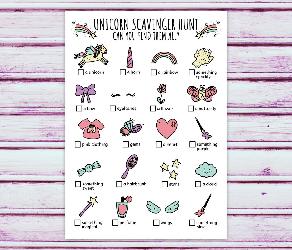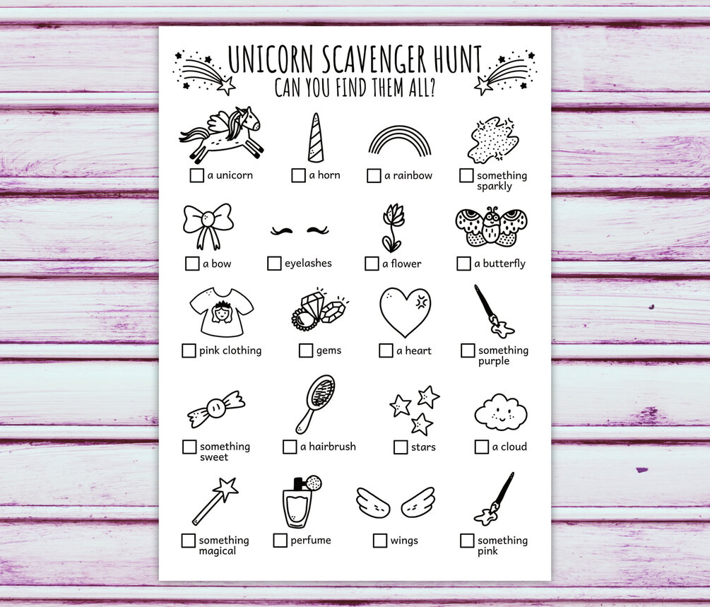 Unicorn Scavenger Hunt For Kids, Magical Unicorn Treasure Hunt And Unicorn Girl Birthday Party Game (Printable PDF in Color + B/W)