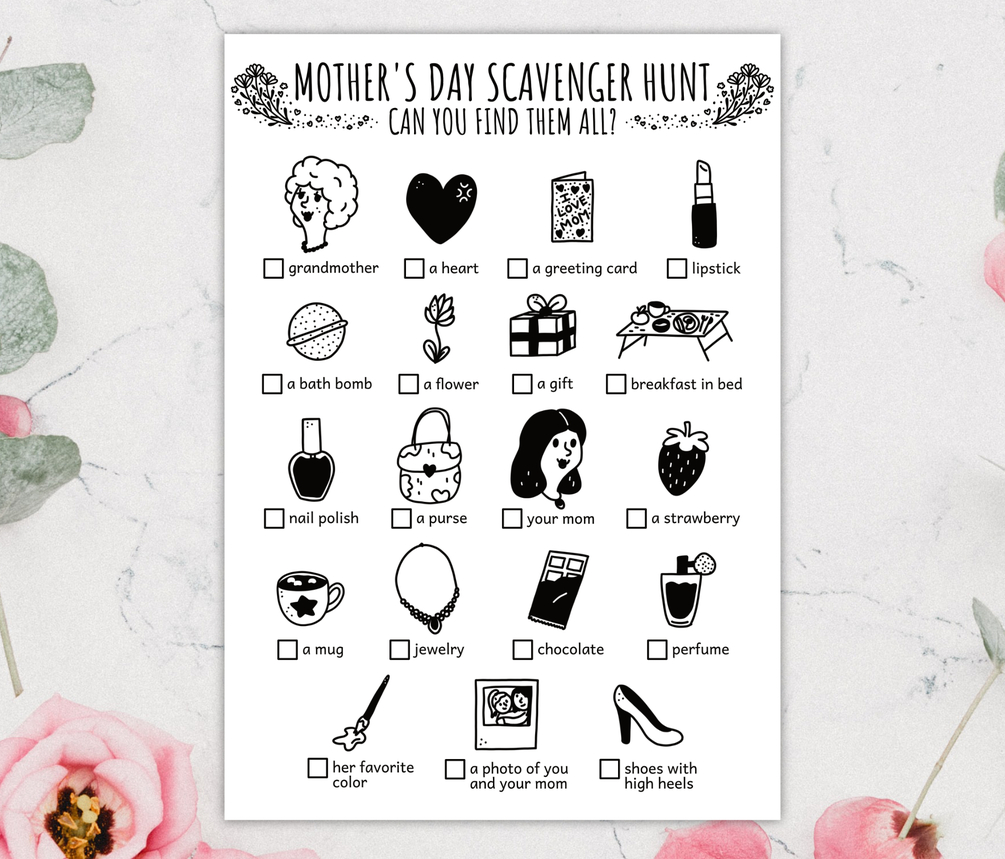 Mother's Day Scavenger Hunt For Kids, Indoor Kids Activity And Mother's Day Activity For Kids (Printable PDF in Color + B/W)