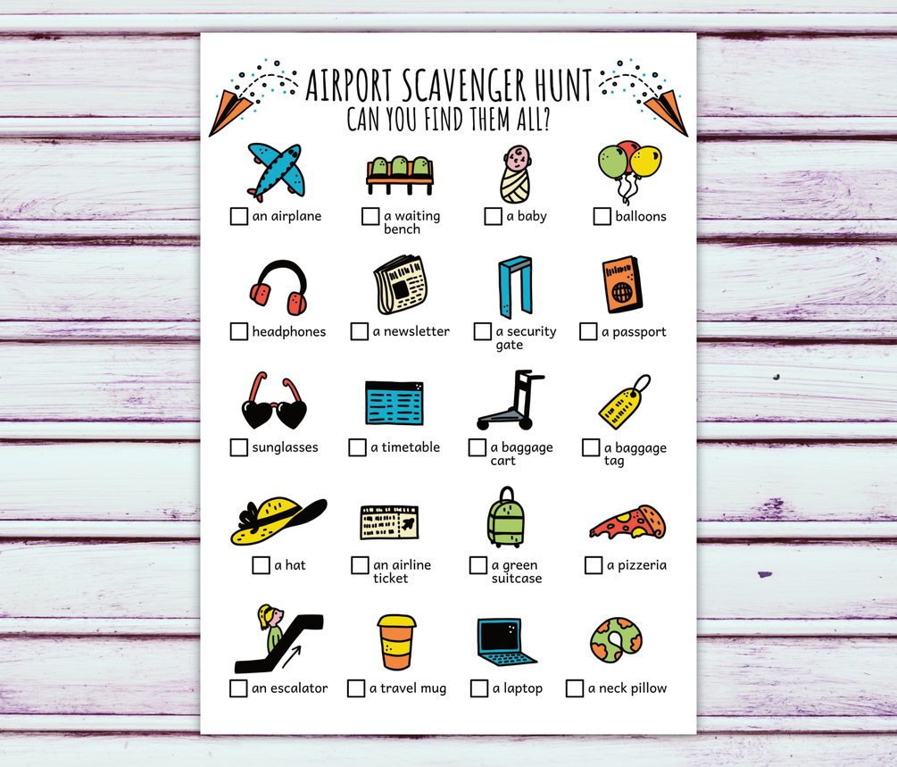 Are you going on vacation by airplane and want to keep your kids busy while you're waiting at the airport?Get this printable airport scavenger hunt for kids! This colorful travel treasure hunt, search and find game is perfect to keep your children busy during the holidays, to learn about the airport and airplanes, as a family vacation activity, as a homeschool idea, or as a fun outdoors travel birthday party game adventure.