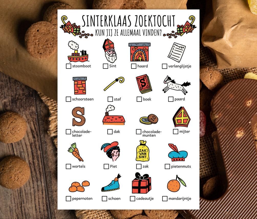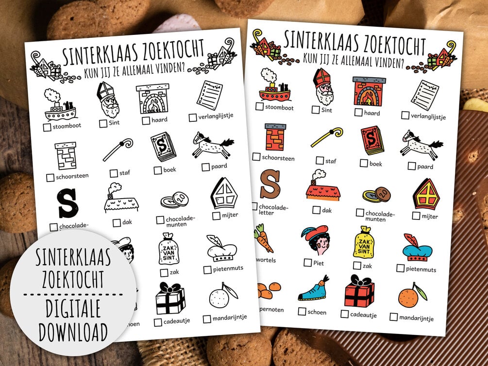 Sinterklaas zoektocht voor kinderen, Winter speurtocht, Nederlands Sint Maarten, Sint en Piet feestspel (afdrukbare PDF in kleur + Z/W)