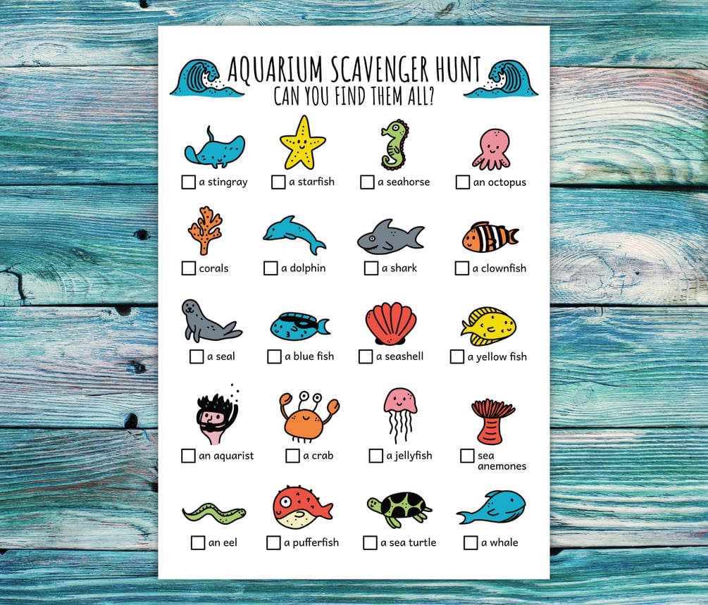 Get your kids or class outside to explore and discover the world around them with this printable public aquarium scavenger hunt for kids! This colorful ocean treasure hunt, search and find game is perfect for keeping your children busy during a public aquarium visit, learning about the ocean and under the sea, as a school trip activity, as a homeschool idea, or as a fun ocean birthday party game adventure.