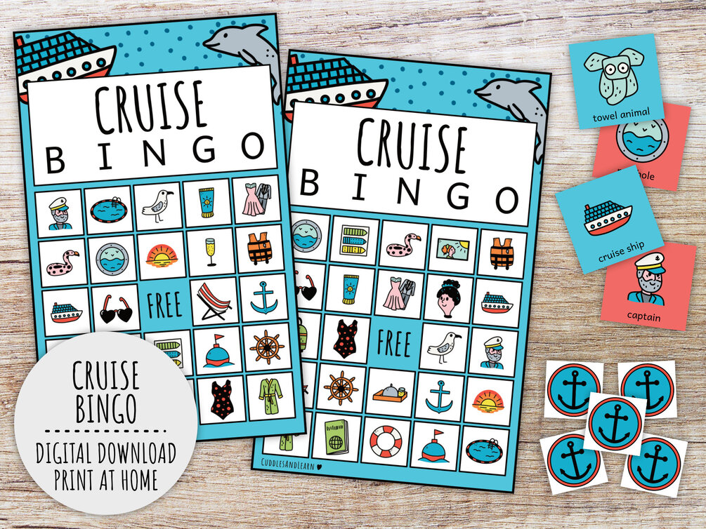 Ahoy! Little sailors will have a lot of fun with this cute 5x5 cruise bingo game! This colorful nautical-themed kids game is perfect for keeping your children busy during a long cruise trip, learning about cruises and travel, as a school activity, as a homeschool idea, or as a fun cruise ship-themed party game adventure to fill your summer vacation on a cruise holiday evenings with.