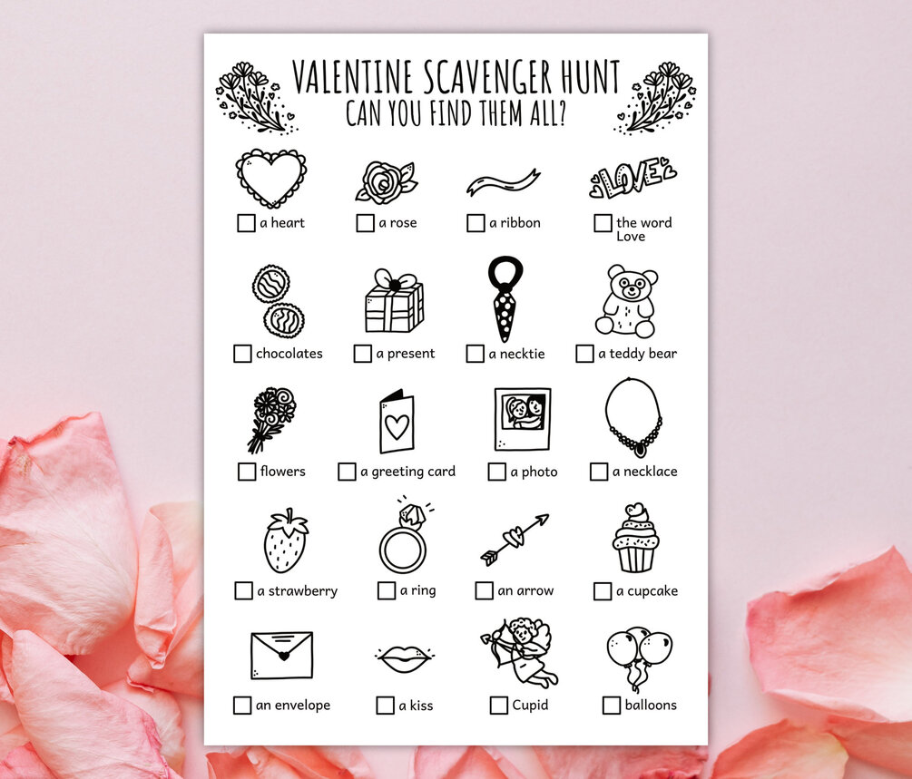 Valentine Scavenger Hunt For Kids, Romantic Treasure Hunt, Valentine day Activity And Love Scavenger Hunt (Printable PDF in Color + B/W)