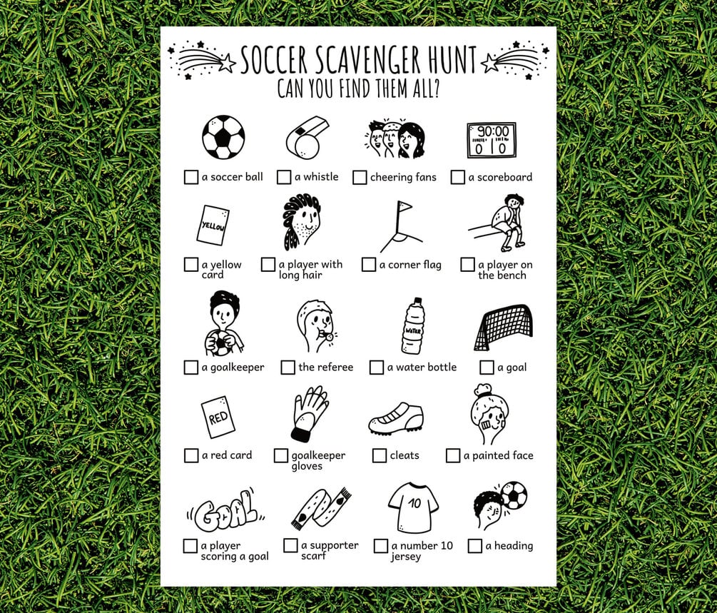 Soccer Scavenger Hunt For Kids, Football Treasure Hunt And Football Birthday Party Game (Printable PDF in Color + B/W)