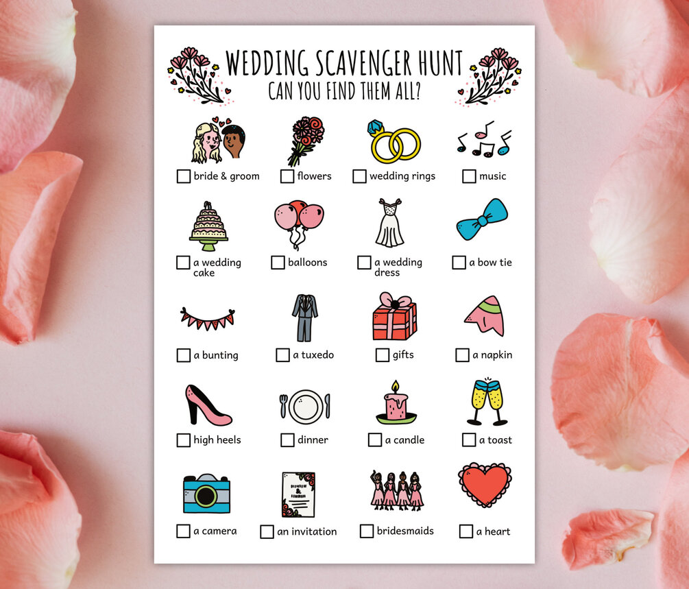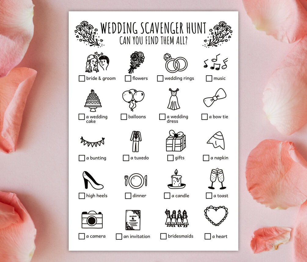Wedding Scavenger Hunt For Kids, Bridal Romantic Treasure Hunt, Marriage day Activity And Love Scavenger Hunt (Printable PDF in Color + B/W)