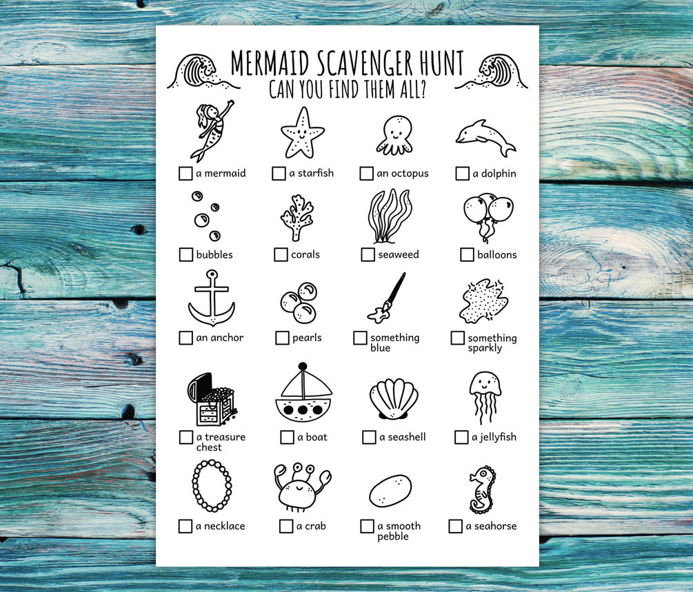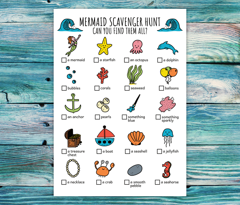 Get your kids or class outside to explore and discover the world around them with this printable mermaid scavenger hunt for kids! This colorful magical sea treasure hunt, search and find game is perfect to keep your children busy during a mermaid birthday party, to learn about mermaids, as a school activity, as a homeschool idea, or as a fun ocean-themed birthday party game adventure.