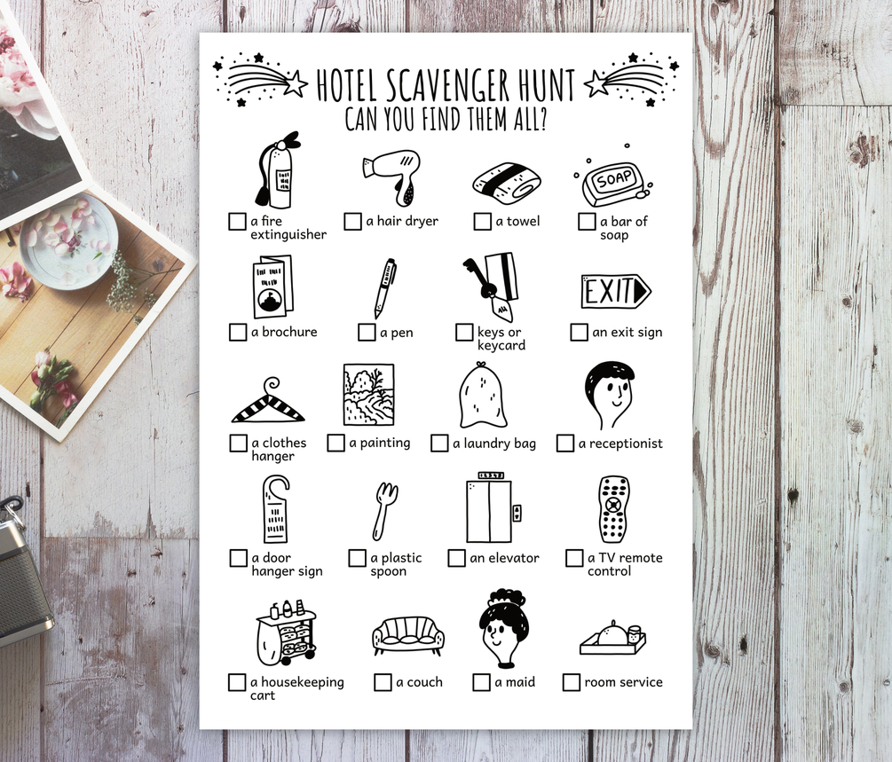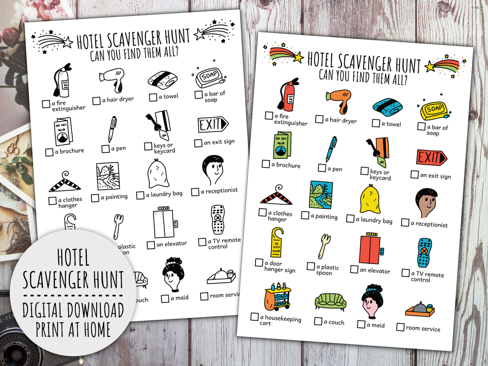 Hotel Scavenger Hunt For Kids, Travel Treasure Hunt, Family Vacation And Hotel Resort Scavenger Hunt (Printable PDF in Color + B/W)