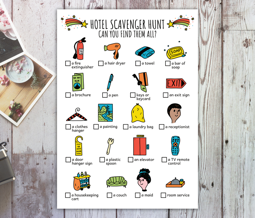 Are you going on vacation and stay in a hotel? If want to keep your kids busy while you're waiting or resting at the hotel, get this printable hotel scavenger hunt for kids! This colorful travel treasure hunt, search and find game is perfect to keep your children busy during the holidays, to learn about hotels and resorts, as a family vacation activity, as a homeschool idea, or as a fun indoor hotel party game adventure.
